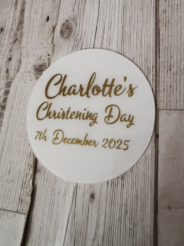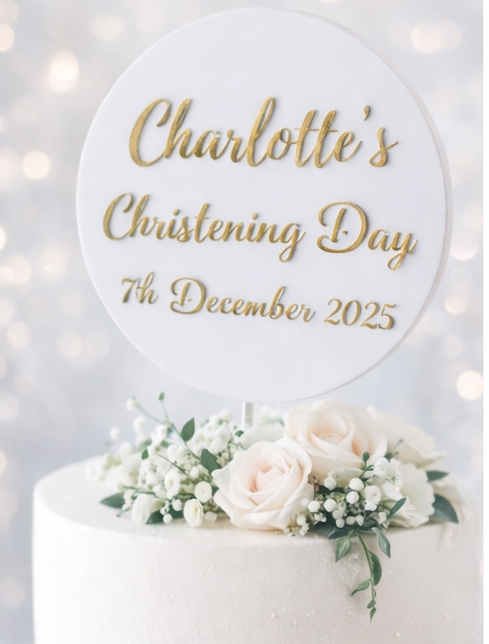 Personalised Christening Day Acrylic 4" Round Cake Topper Gold