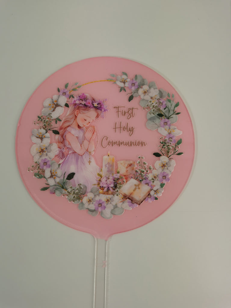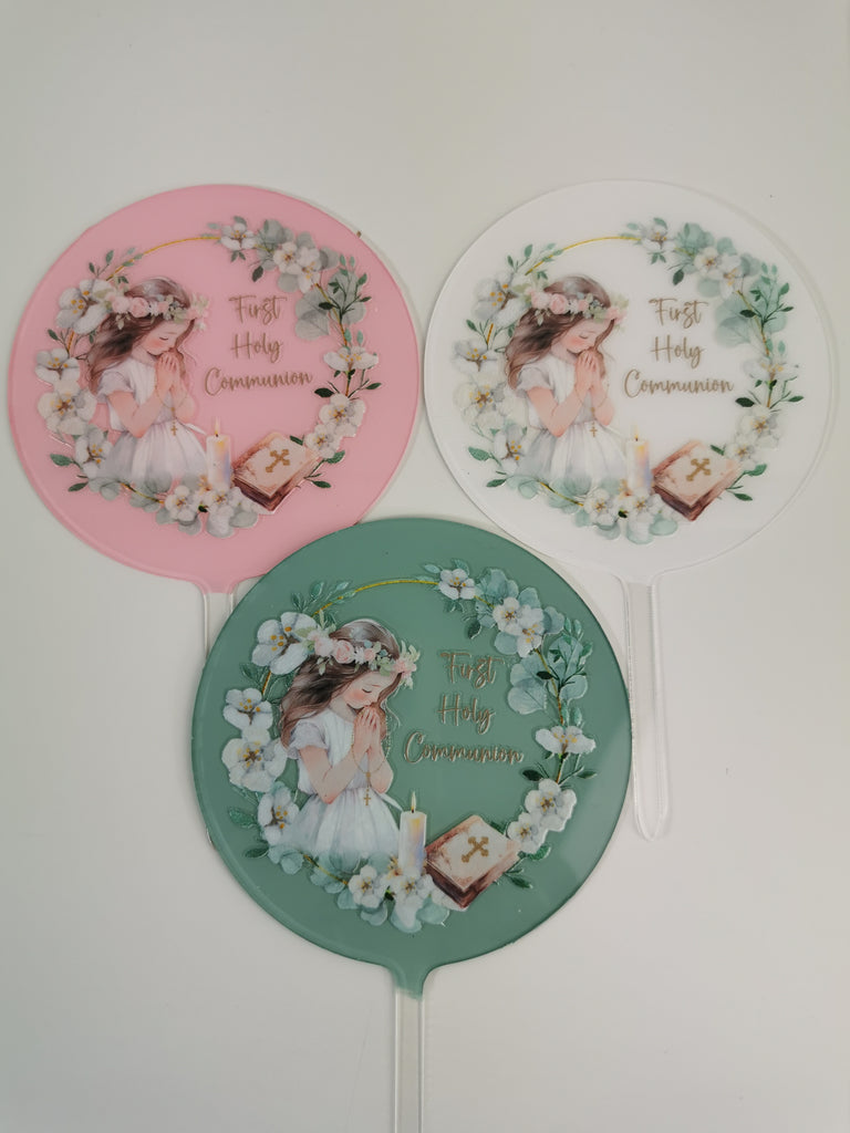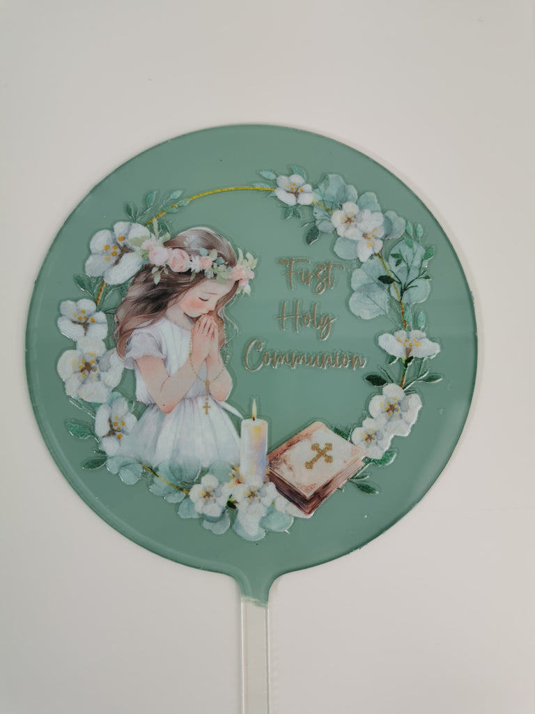 Round 4" acrylic cake topper with 'First Holy Communion Girl ' decal in ivory, green , gold , pink & lilac tones with a choice of Dark Hair or Blonde Hair