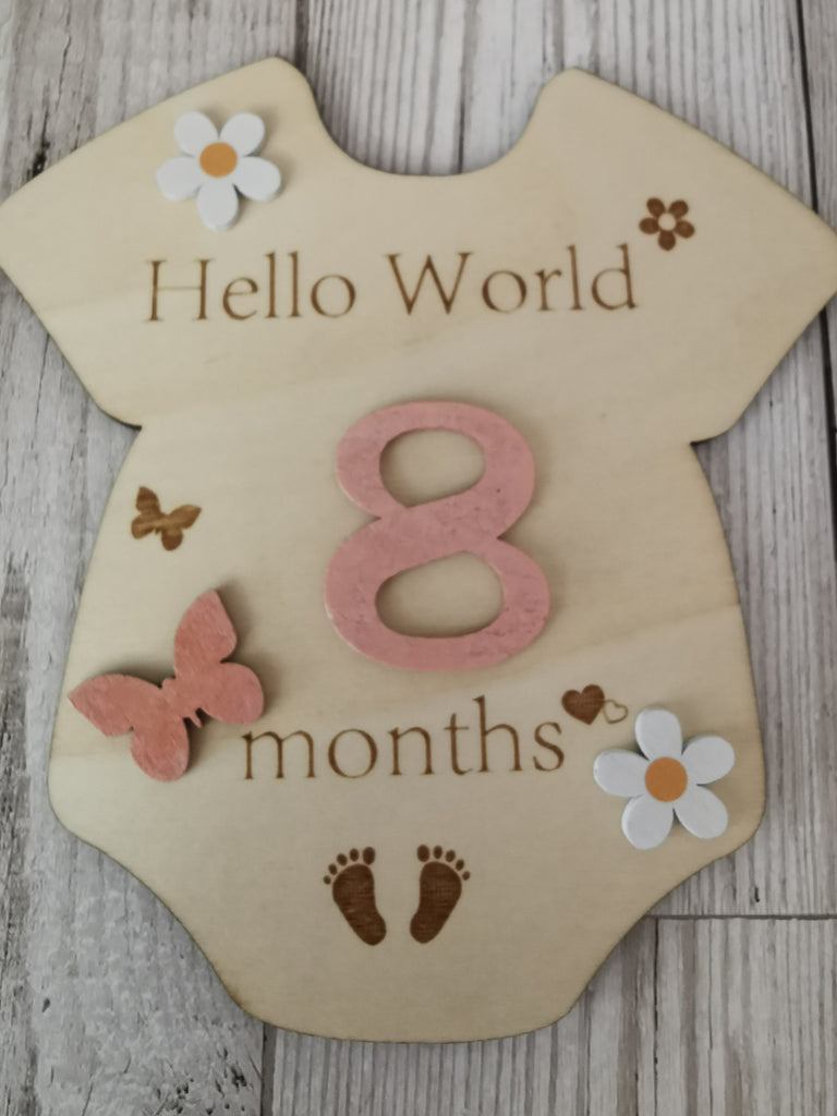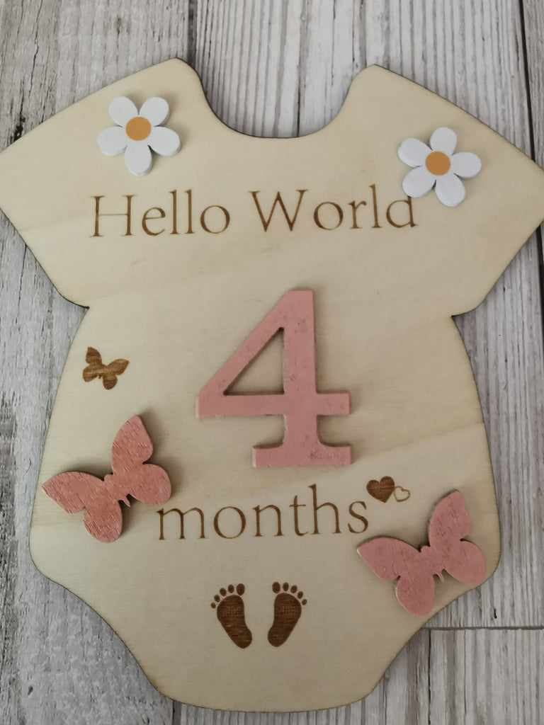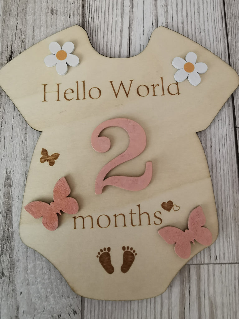 Beautiful Baby Onesie shaped wooden plaque with Pink numbers 0-12 , pink butterflies & cute wooden daisies